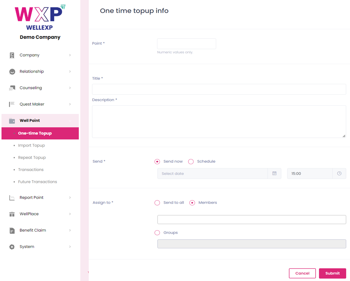 **One-Time Topup**: ตั้งค่าการให้ Point 1 ครั้ง เลือกผู้รับพนักงานได้หลากหลาย สร้างทีละรายการ <br>